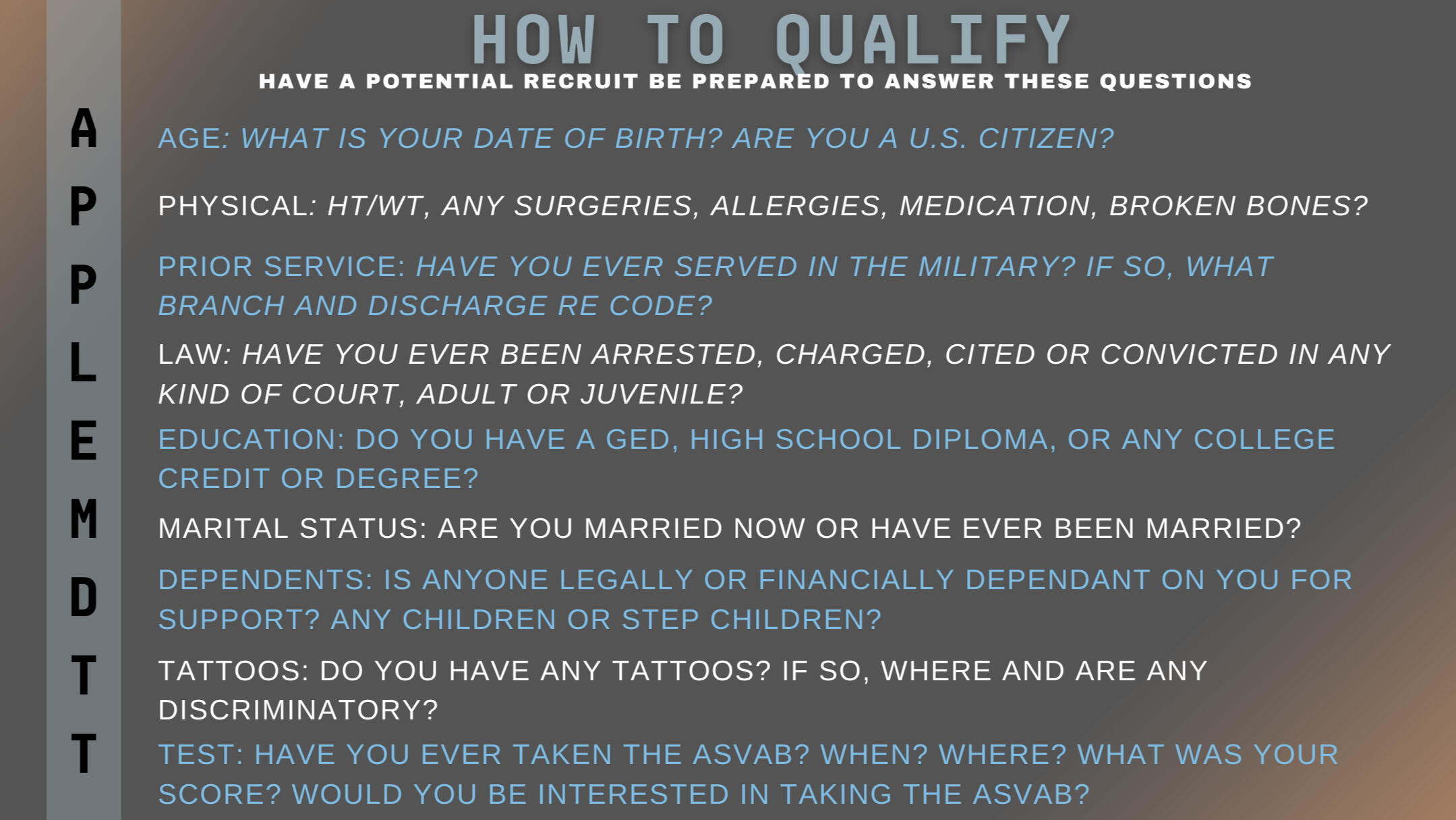 Provide motivation, encouragement, and moral support until the enlistment of a new member. Be available to them from initial contact through the enlistment process, up to the beginning of their initial entry training.