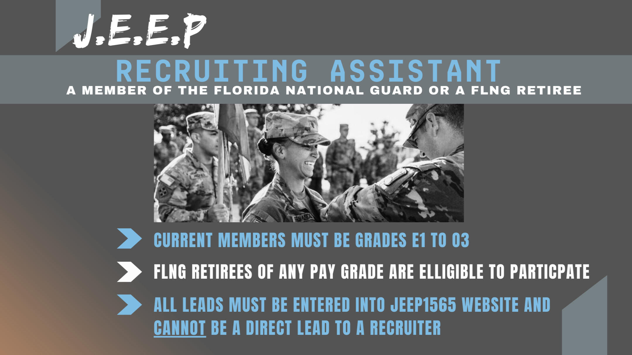 The overall aim of JEEP is to gain assistance in enlisting Soldiers and Airmen into the Florida National Guard. The JEEP program will provide a monetary incentive of $1000 to Soldiers, Airmen, and retirees who can provide a lead to recruiters that results in an enlistment. This is a joint effort for tomorrow’s Florida National Guard!