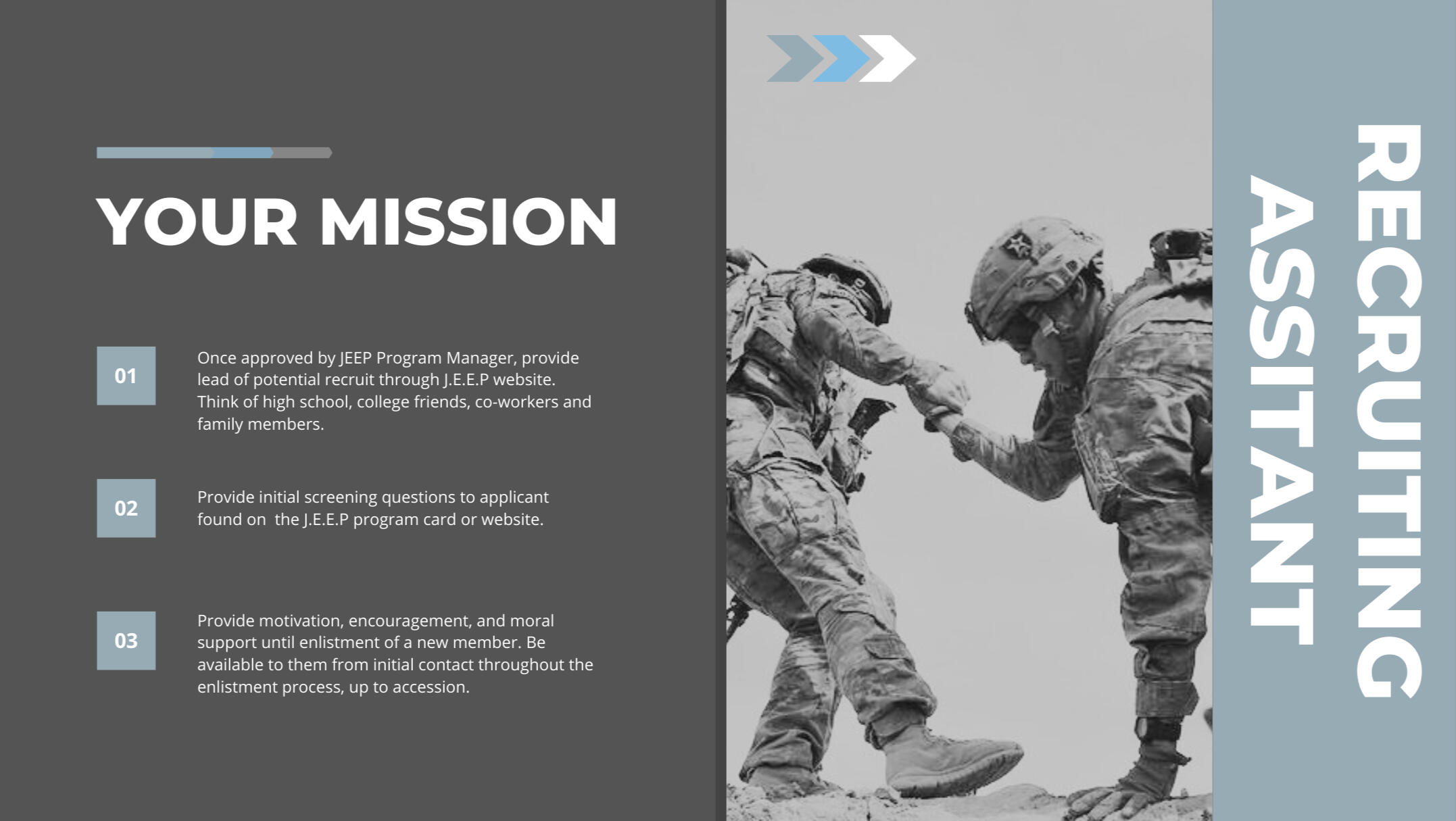 Assistants will be expected to guide, motivate, and encourage recruits all the way up to the point of enlistment.